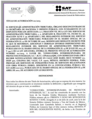 Servicios: Significan, en términos del artículo 16 de la ley, los servicios objeto de este título de autorización, descritos en la convocatoria pública No. SAT AGRS-010/2012, publicada en el diario oficial de la federación el 5 de abril de 2012: los servicios de infraestructura de servicios relacionados con obra pública (SISRO), consistente: