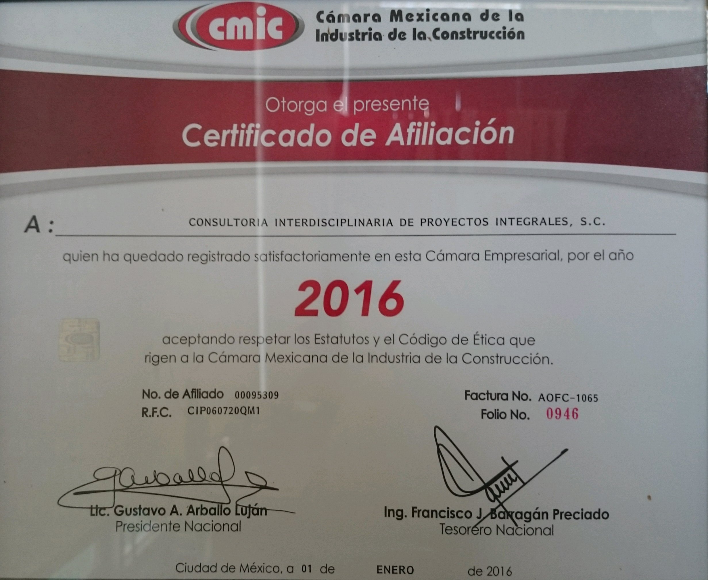 Certificado de afiliación CMIC 2016