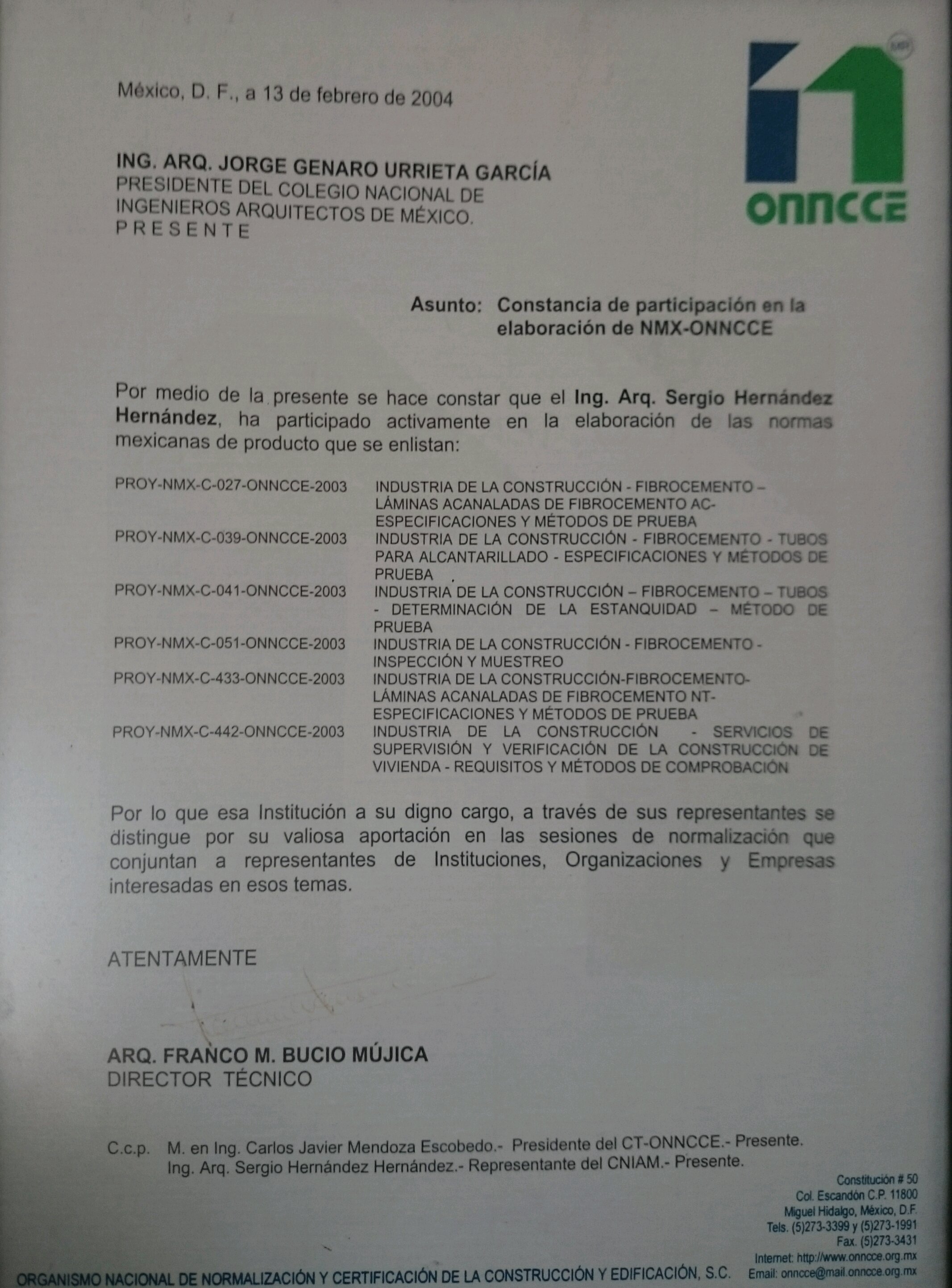 Constancia de participación en la elaboración de NMX-ONNCCE