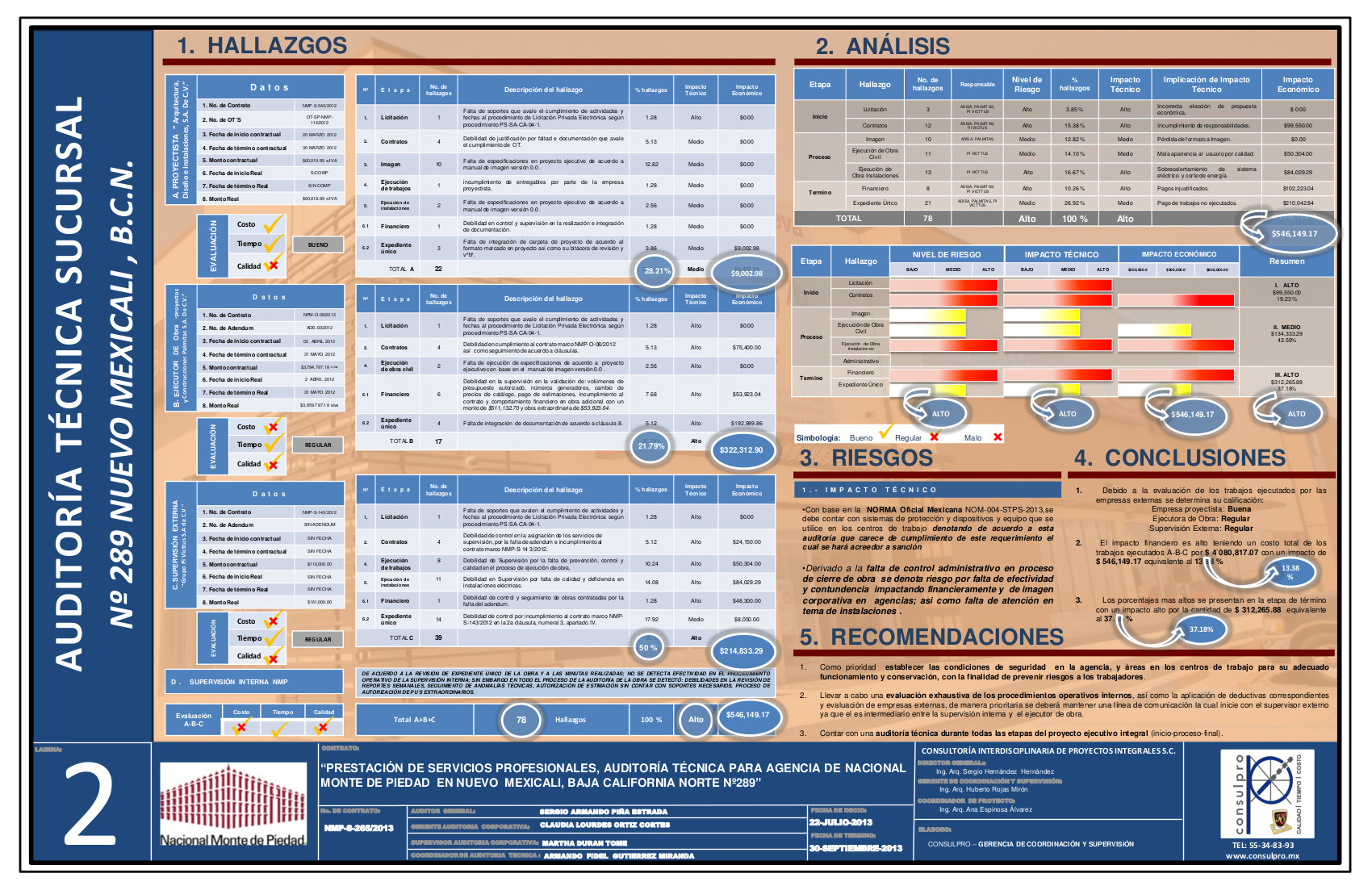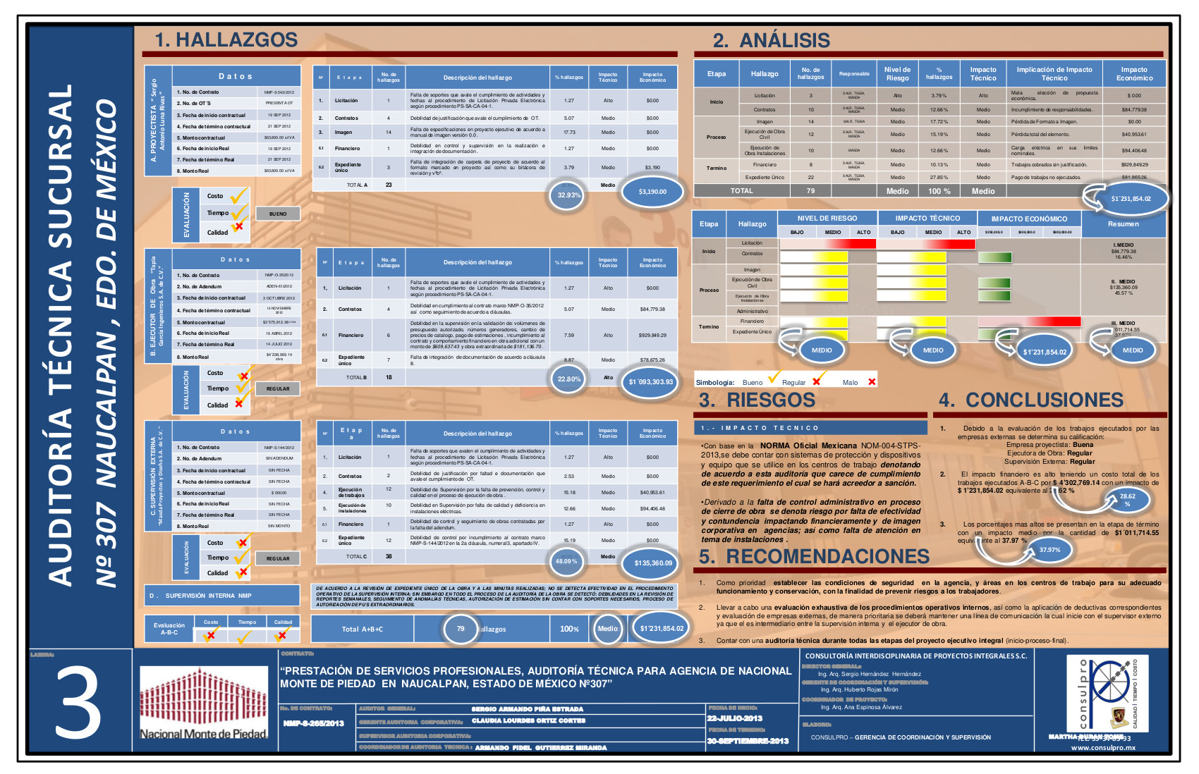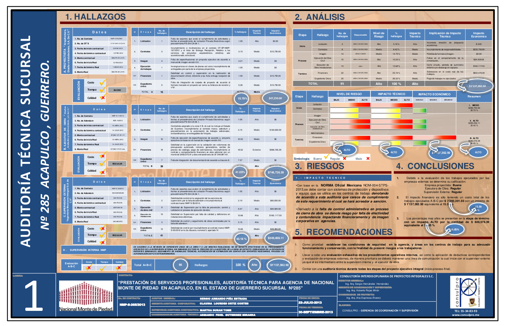 consulpro ha implementado una metodología que permite una revisión y ANÁLISIS a detalle de una obra ejecutada o en proceso, mediante el pleno conocimiento por parte del auditor de todos los aspectos reglamentarios y de contratación, que sirvieron de base a una empresa específica para la realización de un trabajo determinado, dictaminando la calidad y cumplimiento de cada una de ellas, a su vez recomendando, de acuerdo a los resultados de la evaluación, las políticas a seguir, con la idea primordial de proteger al máximo los intereses del cliente.