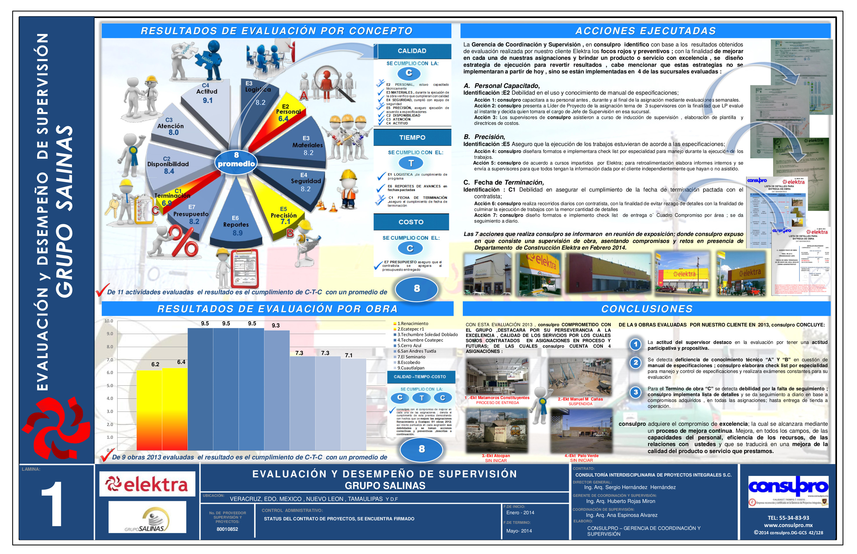 La Coordinación de Obra (Supervisión y Administración) se basa en los procesos establecidos mediante la organización, planeación, dirección y control, los cuales llevan a una calidad de servicio en constante mejora, siempre apegados a la normatividad y reglamentaciones vigentes., buscando siempre la máxima eficiencia, Implementando un procedimiento técnico-operativo con su certificado ISO-9001:2008 que garantiza a nuestros clientes los tres aspectos importantes en sus obras (calidad-tiempo-costo) CTC.
